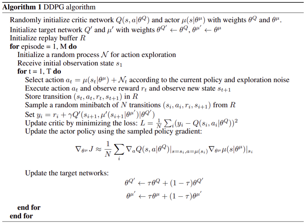 \[\mu'(s_t) = \mu(s_t|\theta^{\mu}_t) + \mathcal{N}\]The pseudocode is presented below: