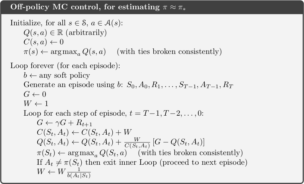 The previous two algorithms are on-policy methods. The off-policy MC control is shown below. The agent follows the behaviour policy while learning about and improving the target policy. Although the target policy may be deterministic, the agent can still sample all possible actions.