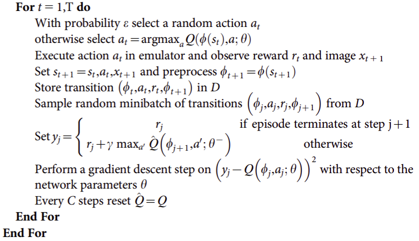 \[L_i(\theta_i) = \mathbb{E}_{(s,a,r,s')\sim U(D)} [(r + \gamma \mathrm{max}_{a'} Q(s',a'; \theta_i^{-})- Q(s,a;\theta_i))^2]\]where \(\theta_i\) is the parameter of Q-network and \(\theta_i^{-}\) is the parameter of the target network, which is updated every \(C\) steps and held fixed between individual updates. The pseudocode of the algorithm