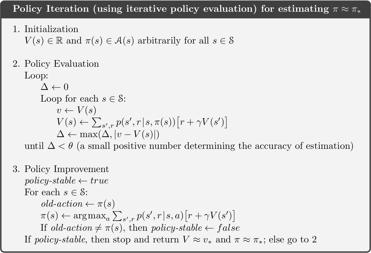 \[\pi'(s) \doteq \mathrm{argmax}_a \sum_{s',r} p(s',r|s,a) [r+\gamma v_{\pi}(s')]\]The detailed algorithm is presented in the pseudocode