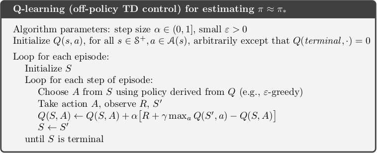 Q-learning is an off-policy TD control method. The action-value function \(Q\) is independent of the policy being followed (\(\epsilon\)-greedy). In particular, the target action value is equal to the sum of immediate reward and the maximal action value at successor state \(S'\). The action \(a\) in the target action value is greedy instead of \(\epsilon\)-greedy in Sarsa.