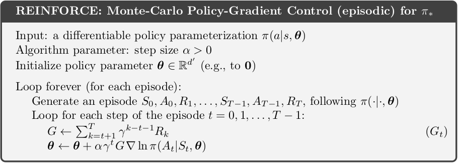 \[\theta_{t+1} =\theta_t + \alpha G_t \ln\nabla \pi(A_t|S_t,\theta_t)\]where \(\alpha\) is the step size, into which the constant of proportionality is absorted.