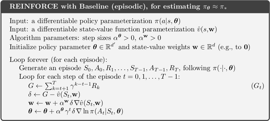 One way to reduce the variance is to include a comparison of the action value to an arbitary baseline \(b(s)\), which can be any variable as long as it does not vary with action.