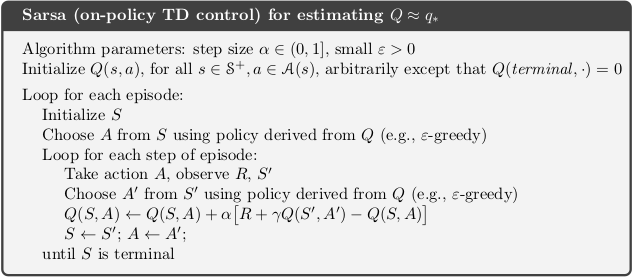 One on-policy TD control method is Sarsa. The target action value is the sum of the immediate reward plus the action value \(Q(S', A')\) where \(A'\) is chosen by the policy, e.g., \(\epsilon\)-greedy.