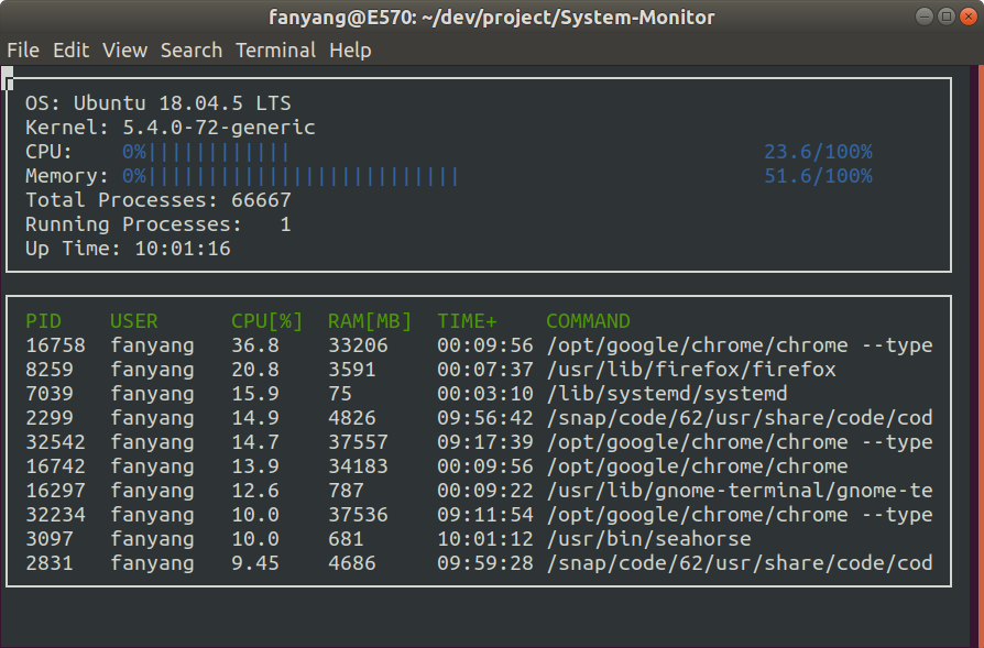 In this project, I created a simple system monitor using c++. As shown in figure below, the system monitor provides the system information and processes information.
