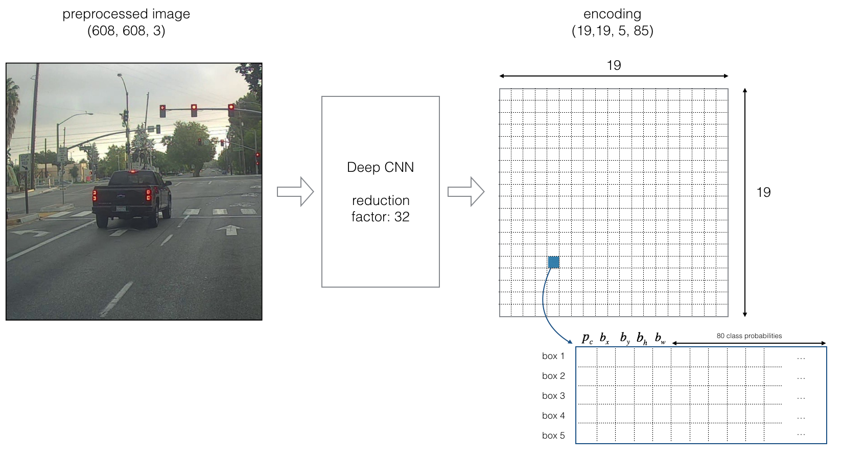 The input of the Deep CNN is image of size (608, 608, 3). The output of the network is an encoding of size (19, 19, 5, 85). More specifically, the input 608X608 image is partitioned by a 19X19 matrix in which each entry represents a part of region in the image. Each region is further represented by a 5X85 matrix, where each row indicates an anchor box with specific height/width ratio. Each anchor box contains information of the bounding box and classification, i.e., \((p_c, b_x, b_y, b_h, b_w, c_1, ..., c_{80})\) where \(p_c\) indicates the probability that the center of an object is in the bounding box. \(b_x, b_y\) refer to the coordinates of the center of bounding box in the current region and \(b_w, b_h\) represent the width and height of the bounding box. \(c_i\) indicates the probability that the object belongs to class i. Therefore, there are \(19\times19\times5=1805\) bounding boxes with probability \(\max_i \ p_c c_i\) for class \(\mathrm{argmax}_i \ p_c c_i\). This probability is called the score of box.