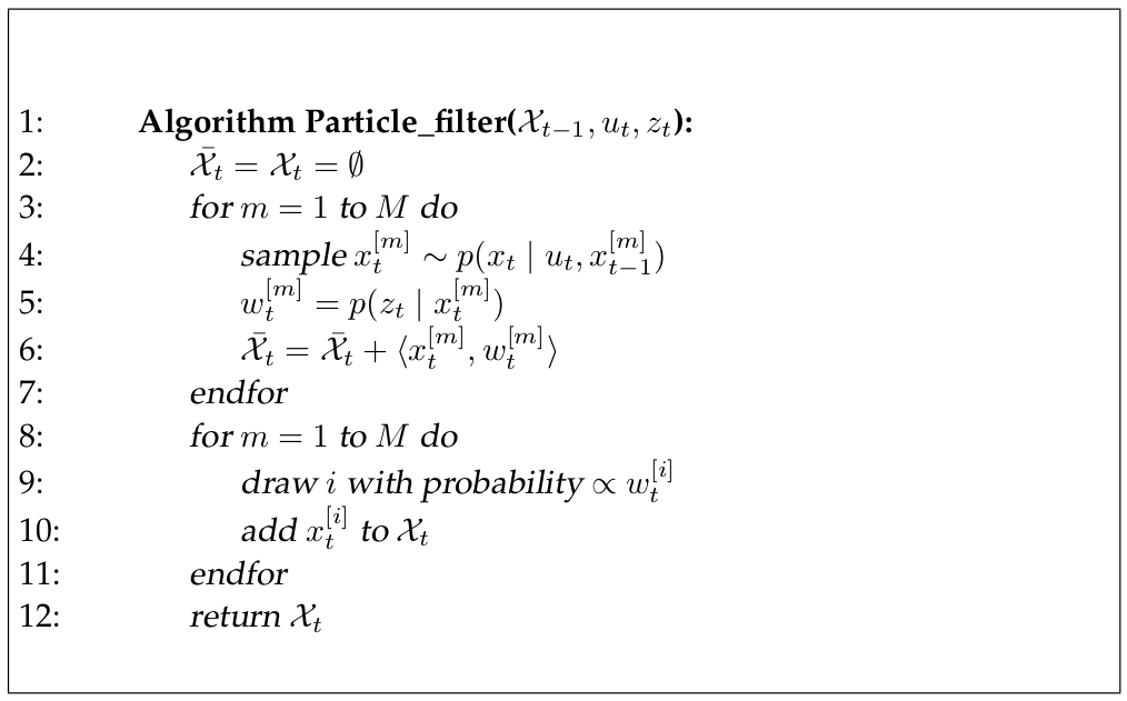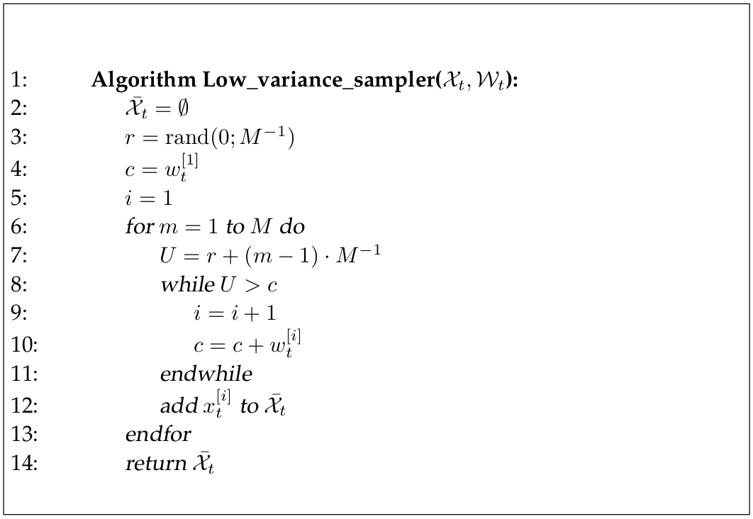 resample_particles(particles, weights): draw with replacement \(M\) (size of particle set) particles from the given set with probability equal to the weight. The resampling is implemented by the low variance resampling with linear complexity.
