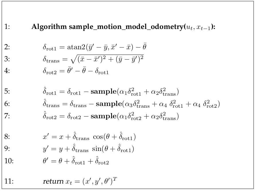 sample_motion_model(odometry, particles): take as inputs the odometry and the current set of particles, sample new particles based on the odometry motion model and the motion noise. The pseudocode[2] is presented below.