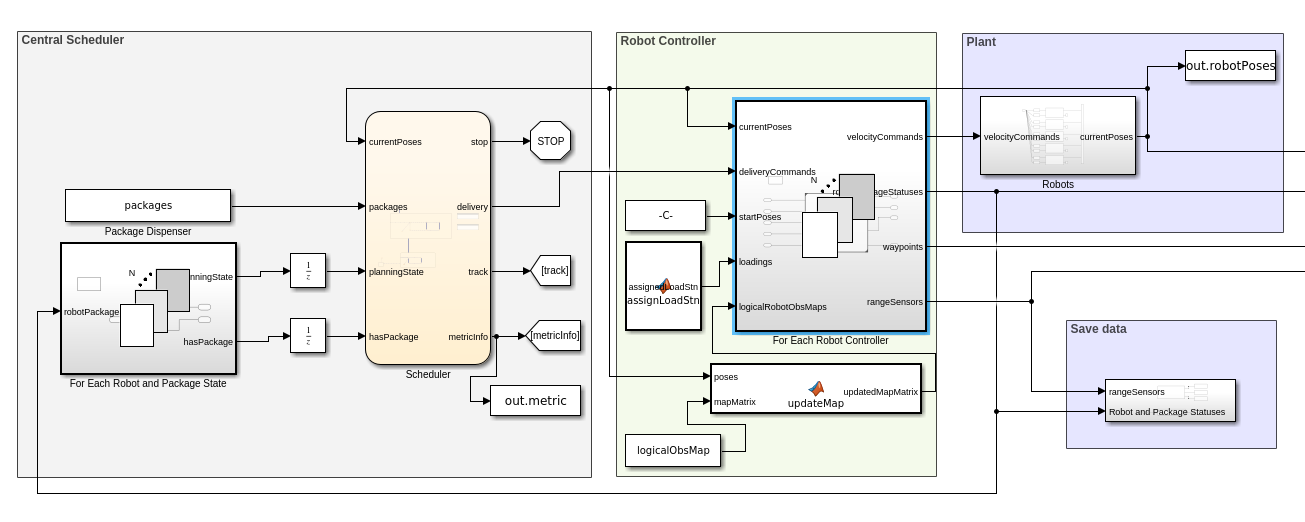 The multi-robot delivery system in this project is modeled in Simulink with the Stateflow charts and Robotics System Toolbox in matlab. The model is comprised of three parts: central scheduler, robot controller, plant.