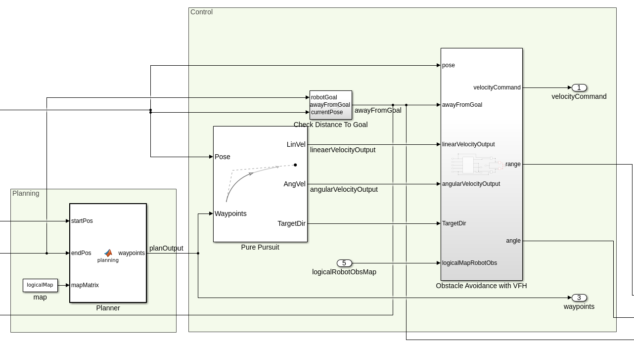 With mobileRobotPRM and pure pursuit, robot is able to work in the environment where the only moving objects are robots. The problem happens when robot are working in the open environment where there are uncontrolled agents. Since those agents are not represented in the occupancy map, they may appear in the planned obstacle-free path for the robots. The VFH block is used to deal with this issue. The VFH check if the direction provided by the pure pursuit is obstacle-free based on the range-bearing sensor readings and compute steering direction closest to the target direction if there are obstacles in front of the robots. In particular, VFH computes polar density histogram to identify obstacle location and proximity. These histograms are then converted to binary histogram to indicate valid steering direction for the robot.