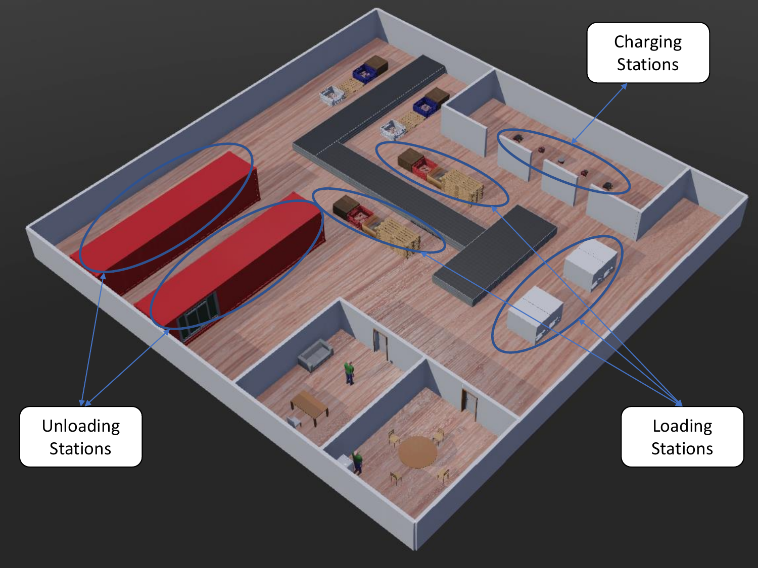 This project designs a multi-robot system working in the warehouse facility or distribution center. The robots are moving around the facility to pick up packages from the loading stations and delivering them to unloading stations for storing or processing as shown in the figure below. It is assumed that the occupancy grid map that represents the free and occupied space is available. However there could be other uncontrolled moving agents working in the same environment and those agents cannot be included in the occupancy map. In this project, the robots working in the open environment are able to avoid both the obstacles represented in the occupancy grid map and the uncontrolled agents.